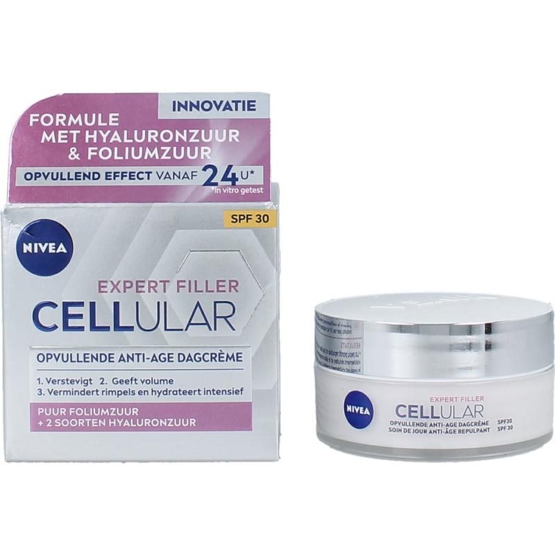 Vermindert rimpels en versnelt het huideigen vernieuwingsproces bij regelmatig gebruik. Extra bescherming tegen huidveroudering met SPF30: NIVEA CELLular Hyaluron Filler +Verstevigend Dagcrème SPF30
